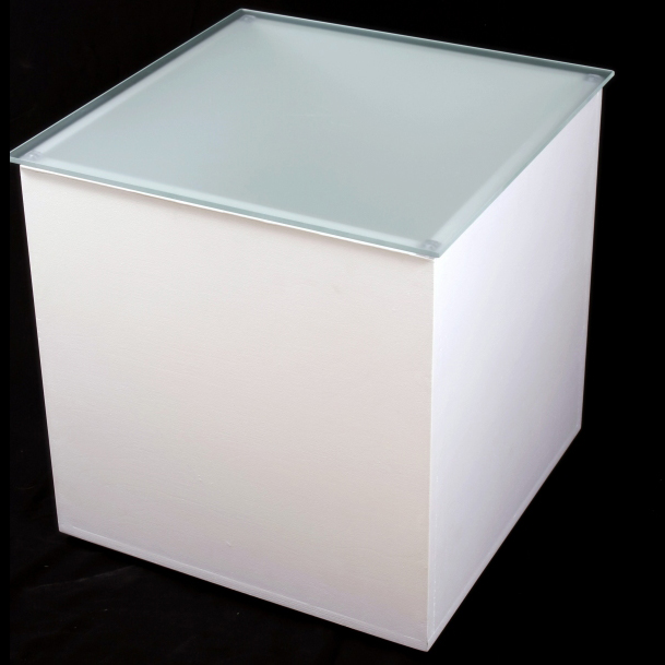 Die Abstellfläche besteht aus einer satinierten Acryl-Glasplatte. Bei eingeschalteter Beleuchtung erstrahlen die Oberfläche und die abgestellten Gegenstände in Weiß.